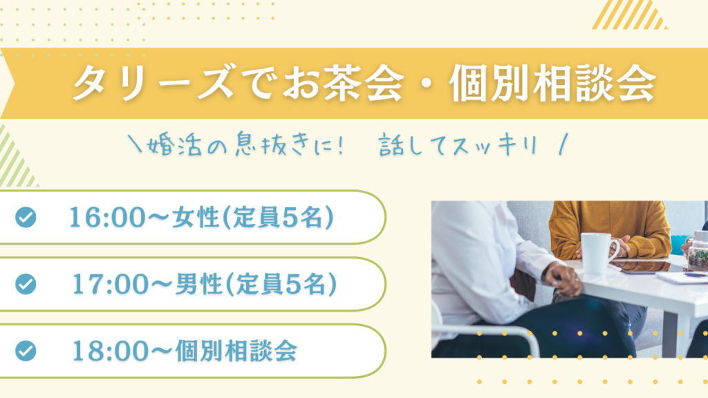 11/2(土)16:00〜女性 17:00〜男性 タリーズでお茶会&個別相談会のお知らせ