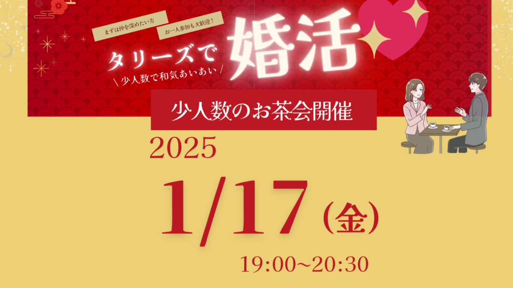 タリーズコーヒーで婚活お茶会開催! 大人数の婚活イベントがちょっと苦手…。もっとリラックスして自然にお話ししたい!そんな方にぴったりの 少人数制お茶会 です。 進行役が会話をサポートするから、初めての方でも安心してご参加いただけます。「婚活だ... -
