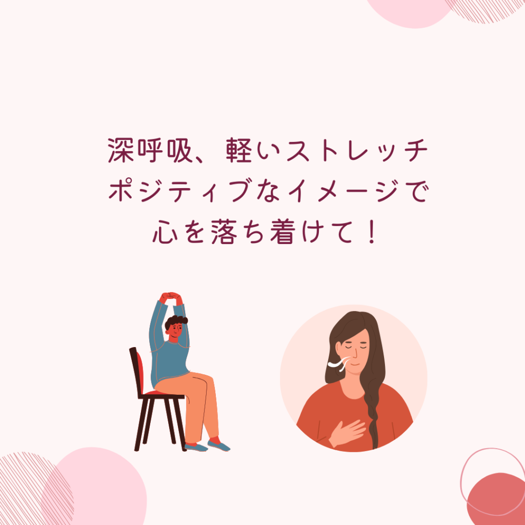 - 深呼吸をする:ゆっくりと深く息を吸い、吐くことで自律神経が整い、緊張が和らぎます。