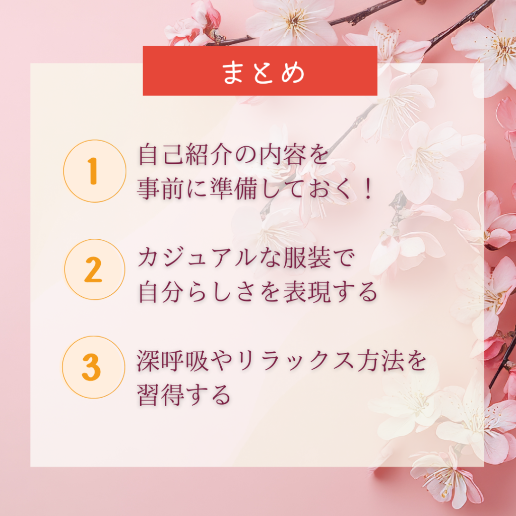 これらの内容を簡単にまとめ、自然に話せるように何度か練習しておくと、自信を持って自己紹介ができるでしょう。また、過剰に自分を良く見せようとする必要はありません。自然体で、自分らしさを伝えることを意識しましょう。