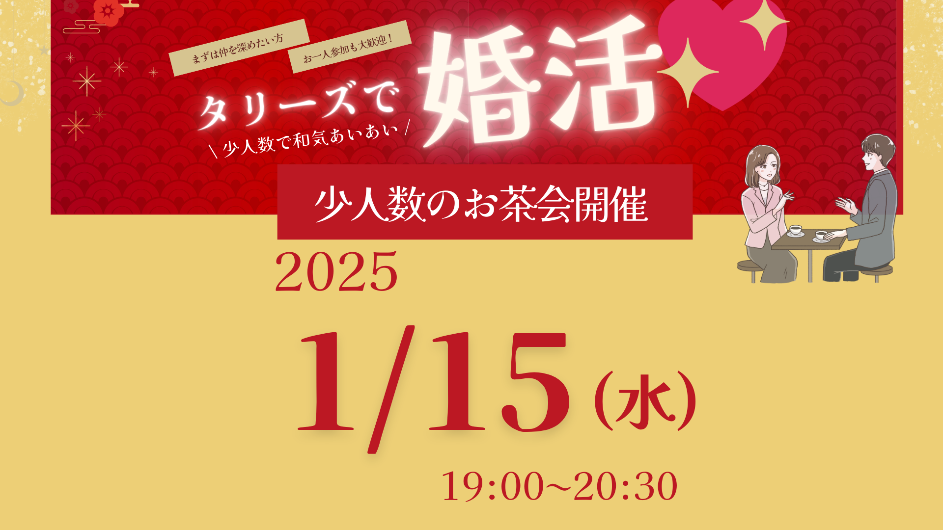 | 参加費 | 男女とも2,000円+ タリーズカードに1,000円以上チャージの上1ドリンクオーダー 当日現金にてお支払いください |