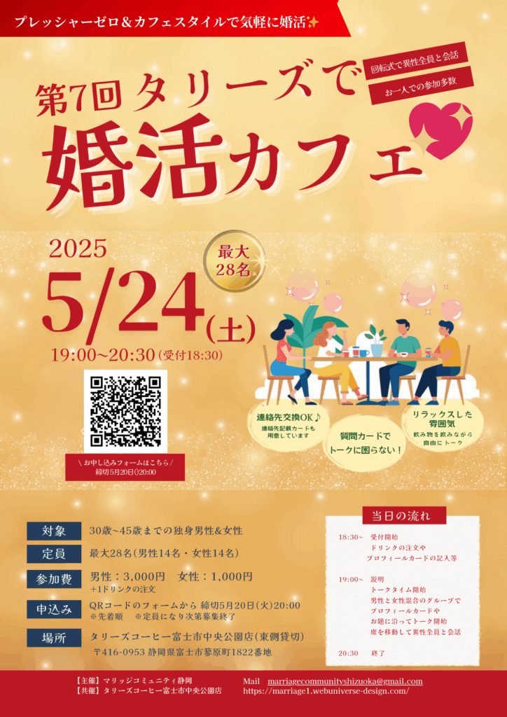 【女性あと1名/男性申込終了】5/24(土)19:00~20:30 タリーズで婚活カフェ(30歳〜45歳)